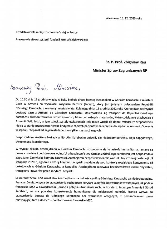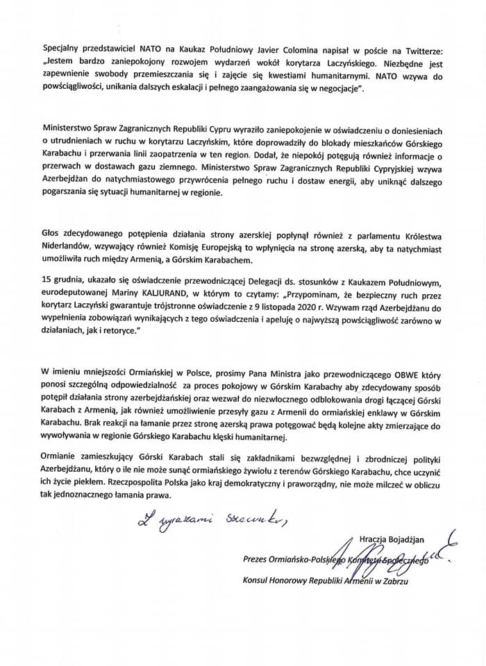Դեկտեմբերի 16-ին Հայ-լեհական հասարակական կոմիտեի նախագահ, համատեղության կարգով Զաբժեում (Լեհաստան) ՀՀ պատվավոր հյուպատոս Հրաչյա Բոյաջյանը, Լեհաստանի հայ առաքելական եկեղեցու հոգևոր հովիվ Հայր Տարոն Վարդապետ Ղուլիկյանը, Հայ կաթողիկէ քահանա Տ. Թադեուշ Իսակովիչ-Զալևսկին, Կառավարության ազգային և էթնիկ փոքրամասնությունների համատեղ հանձնաժողովում հայ փոքրամասնության ներկայացուցիչ Բոգդան Կասպրովիչը, ինչպես նաև Լեհաստանում գործող հայկական ավանդական կազմակերպությունները համատեղ նախաձռնությամբ դիմում-նամակով դիմել են Լեհաստանի Արտաքին գործերի նախարարություն, Սեյմ և Սենատ՝ կոչ անելով խստորեն դատապարտել ադրբեջանական իշխանությունների գործողությունները և միջոցներ ձեռնարկել անհապաղ ապաշրջափակել Լեռնային Ղարաբաղը Հայաստանի հետ կապող ճանապարհը՝ Լեռնային Ղարաբաղի տարածաշրջանում հումանիտար աղետ առաջացնելուն ուղղված հետագա գործողությունները կանխելու նպատակով: