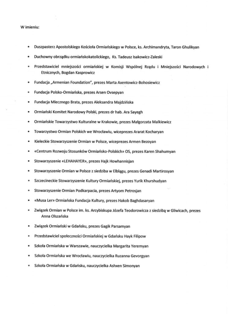 Ավելացնենք, որ դիմումի տակ ստորագրել են Լեհաստանում գրանցված 22 հայկական կազմակերպությունների ներկայացուցիչներ։