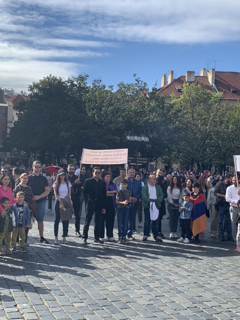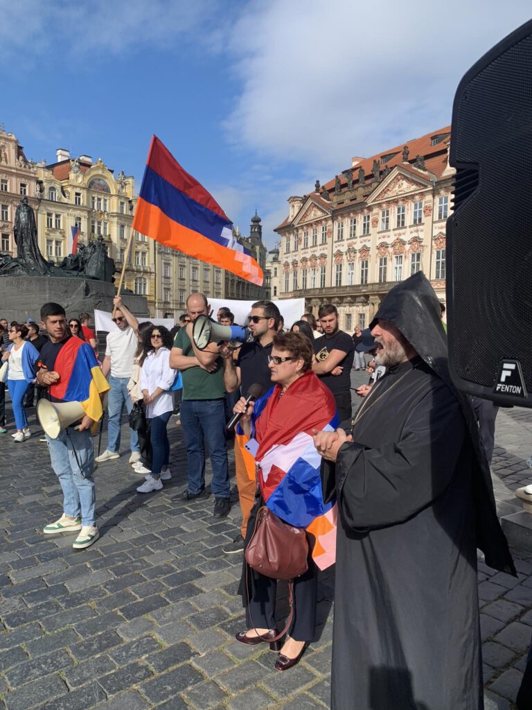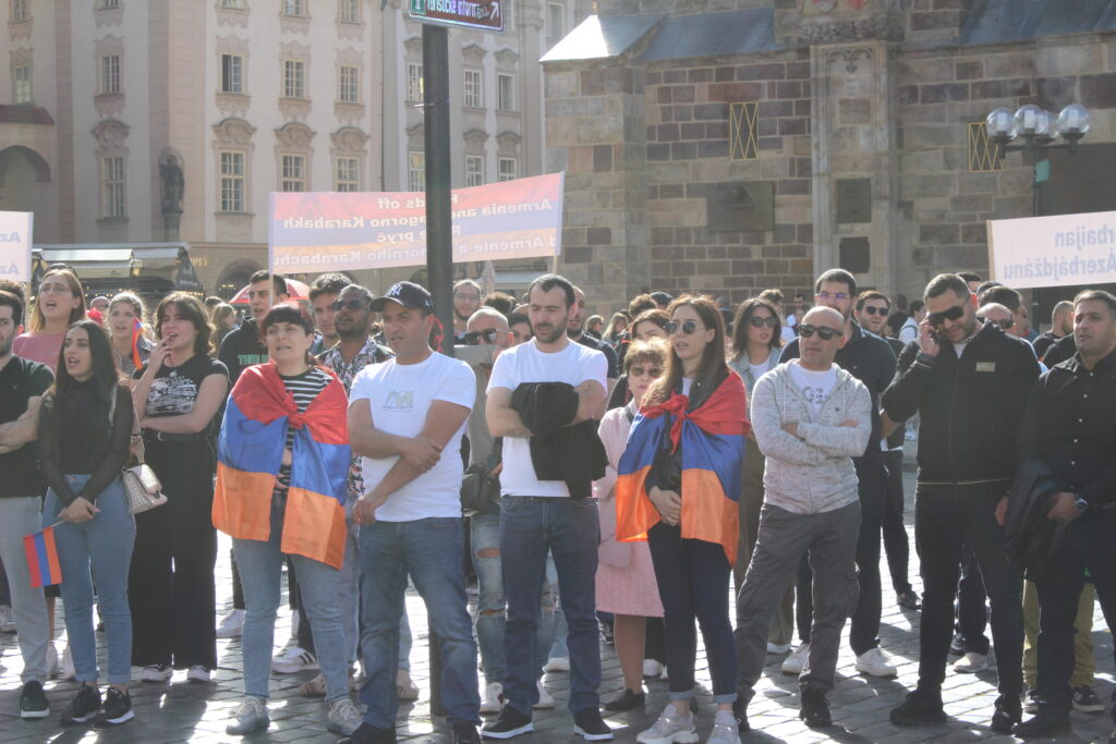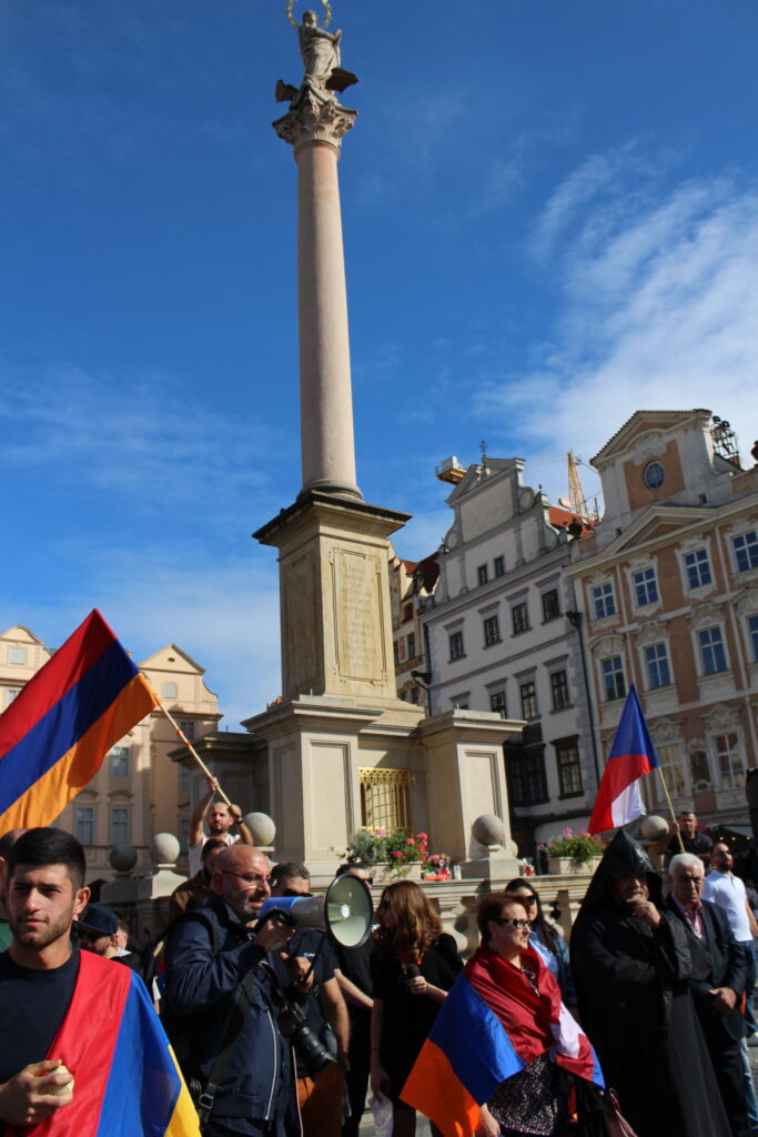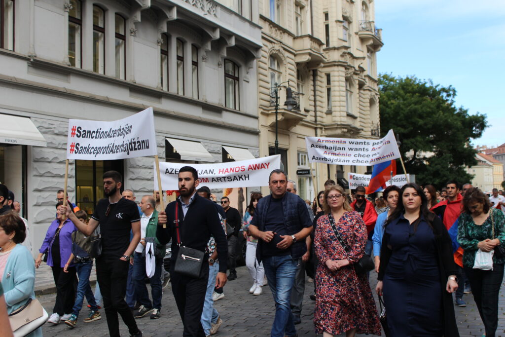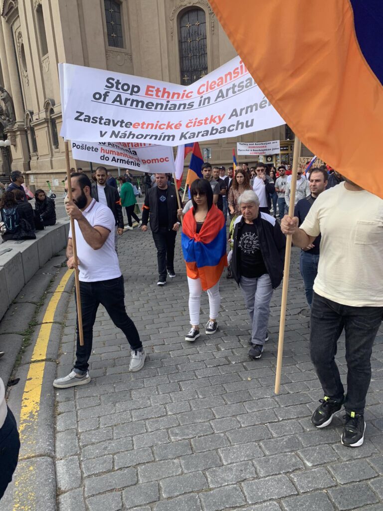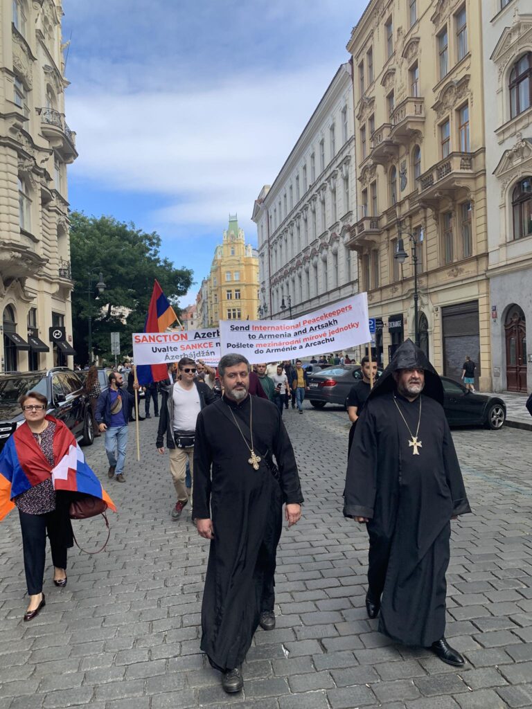 Պրահայի Սուրբ Հոգի եկեղեցում կատարված Արցախի համար աղոթքից ու ժամերգությունից հետո, Չեխիայի հոգեւոր հովիվ Հայր Բարսեղ Փիլավչյանի առաջնորդությամբ հարյուրավոր հայրենակիցներ Արցախի ու Հայաստանի դրոշներով, եւ Ադրբեջանի ագրեսիան դատապարտող լոզունգներով երթով շարժվեցին մինչեւ կենտրոնական Ստարոմեստսկա հրապարակ։