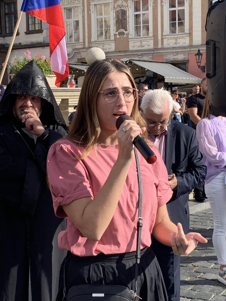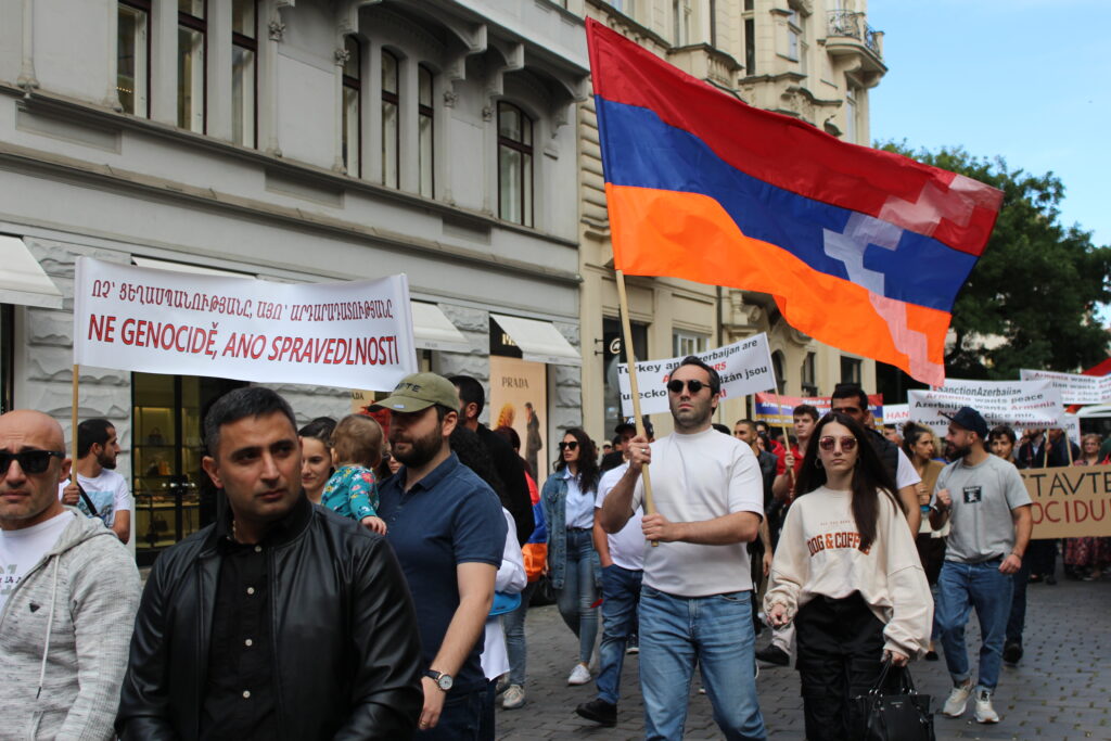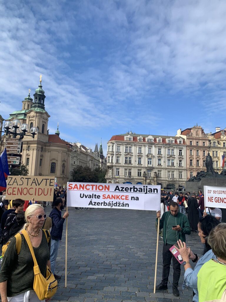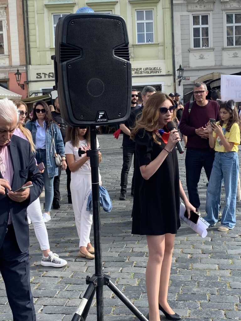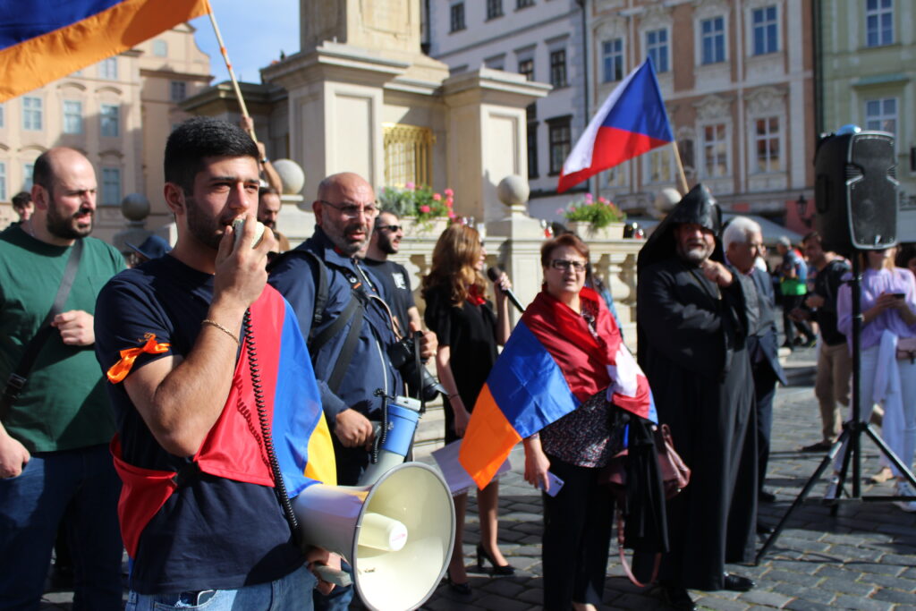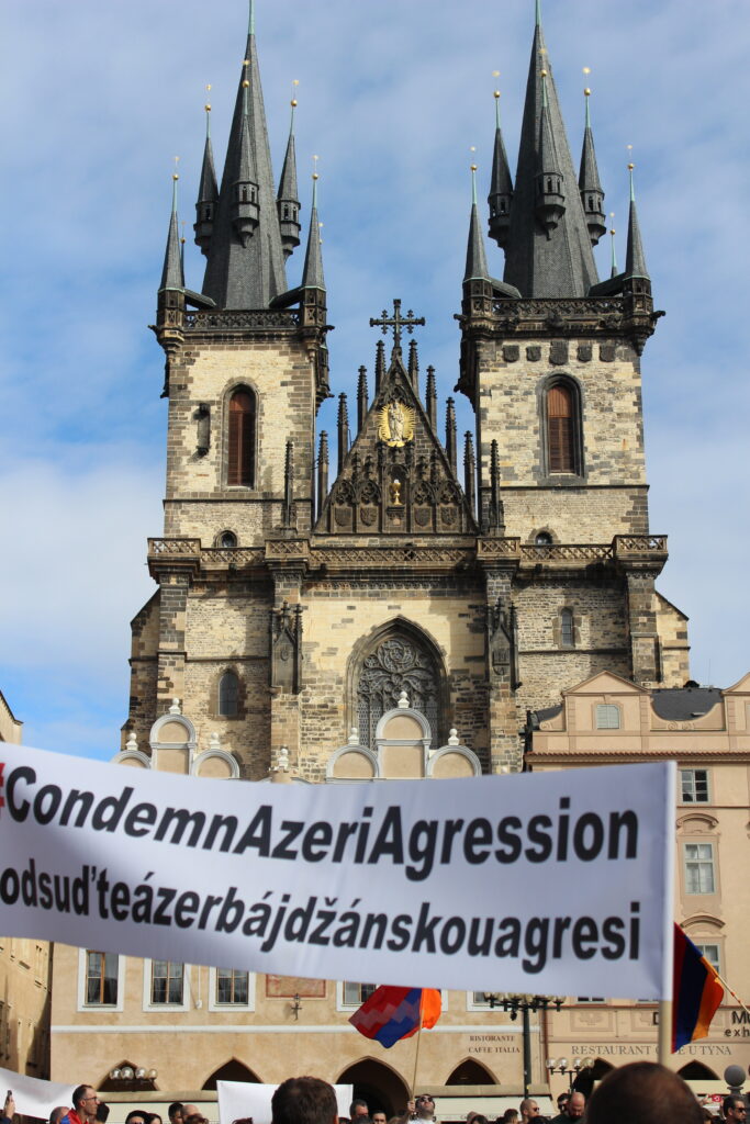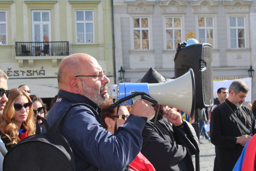 Պրահայի Սուրբ Հոգի եկեղեցում կատարված Արցախի համար աղոթքից ու ժամերգությունից հետո, Չեխիայի հոգեւոր հովիվ Հայր Բարսեղ Փիլավչյանի առաջնորդությամբ հարյուրավոր հայրենակիցներ Արցախի ու Հայաստանի դրոշներով, եւ Ադրբեջանի ագրեսիան դատապարտող լոզունգներով երթով շարժվեցին մինչեւ կենտրոնական Ստարոմեստսկա հրապարակ։