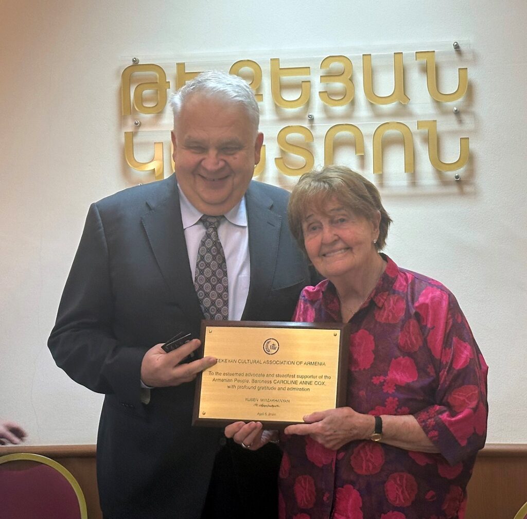Հայաստանի Թեքեյան մշակութային միության նախագահ Ռուբեն Միրզախանյանը բարոնուհի Քերոլայն Քոքսին հանձնեց ՀԹՄՄ պատվո-հուշատախտակ՝ հայ ժողովրդի հարգարժան եւ անսասան աջակցին՝ խորին երախտագիտությամբ եւ հիացմունքով։
