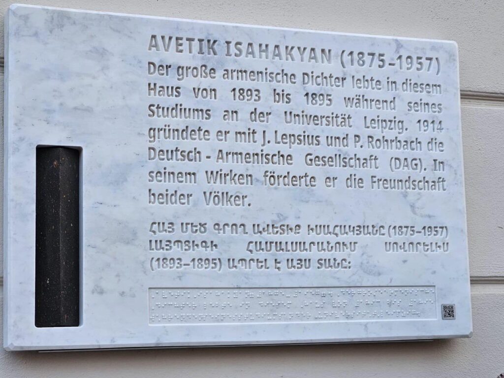 Ինչպես արդեն տեղեկացրել էինք, Գերմանիայի Լայպցիգ քաղաքի Ֆրիդրիխ Էբերթ Շտրասսե-27 (Friedrich-Ebert-Strasse 27) հասցեում բացվել է Ավետիք Իսահակյանի հուշատախտակը, որը կրում է «Ինքնություն» խորագիրը (ճարտարապետ-դիզայներ՝ Հակոբ Իսկուդարյան, քանդակագործ՝ Ռուբեն Նալբանդյան):