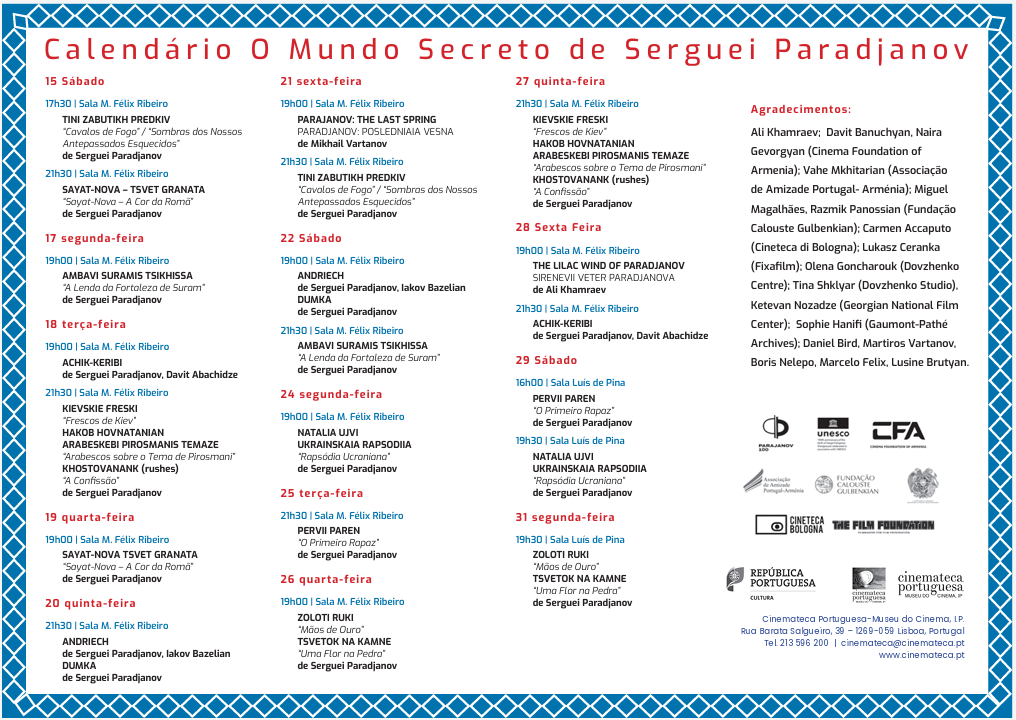 Պորտուգալական Սինեմատեկը և Հայաստանի Կինոյի Հիմնադրամը վրացական և ուկրաինական կողմի գործընկերների հետ համատեղ կազմակերպել են Սերգեյ Փարաջանովի ֆիլմերի հետահայաց ցուցադրությունը, որը նվիրված էր Վարպետի 100-ամյա հոբելյանին։