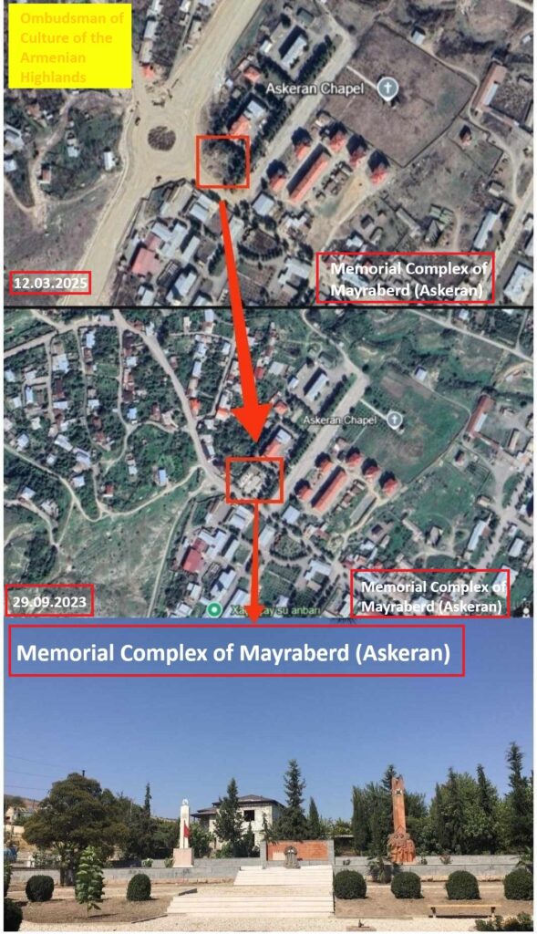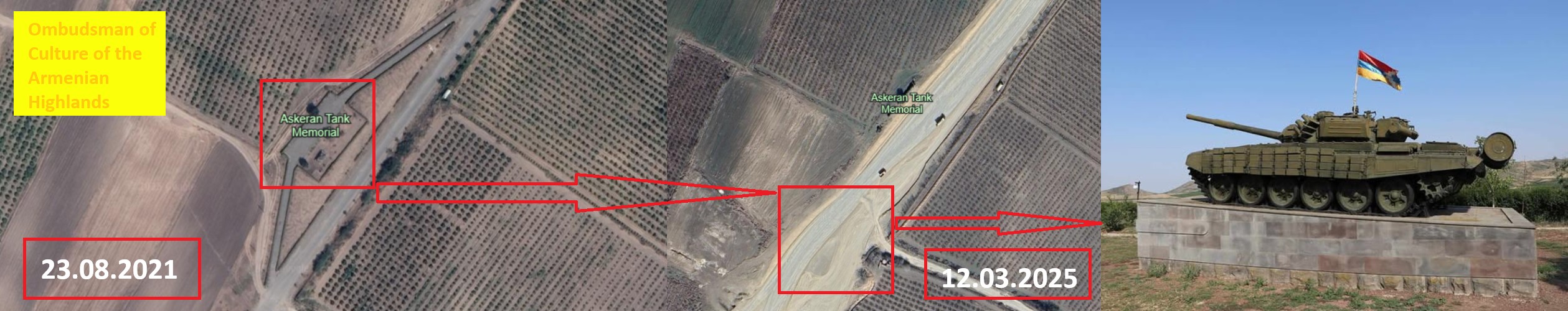 Ինչպես տեղեկացնում է Հայկական լեռնաշխարհի մշակութային ժառանգության օմբուդսմեն Հովիկ Ավանեսով, 2025 թվականի մարտի 12-ի արբանյակային լուսանկարներով արձանագրվել է, որ ադրբեջանական քաղաքականության հերթական թիրախ են դարձել Մայրաբերդի (Ասկերանի) հուշահամալիրը և Մայրաբերդից դեպի Տիգրանակերտ ու Ակնա տանող ճանապարհի ձախ եզրին գտնվող՝ Արցախյան ազատամարտին նվիրված տանկ-հուշարձանը։