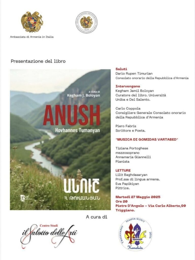 Այս տարի ապրիլին իտալական Բարիում լույս է տեսել Հովհաննես Թումանյանի «Անուշ» պոեմի իտալերեն թարգմանությունը՝ Բարիի համալսարանի արաբերենի դասախոս, պրոֆեսոր Գեղամ Բոլոյանի աշխատասիրությամբ։