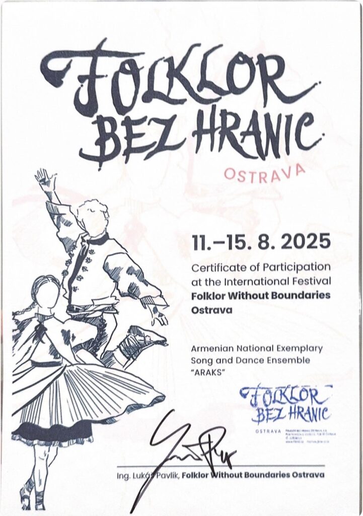 Ինչպես արդեն նշել էինք, Չեխական Օստրավայում օգոստոսի 11-ից 15-ը անցակացված «Ֆոլկլոր առանց սատմաններտ» սիջազգային երաժշտական փառատոնում հանդես եկավ «Արաքս» Հայկական ժողովրդական պարախումբը, որը ժամանել էր ֆրանսիական Գրենոբոլից եւ ուկրաինական Խարկովից։ Նշենք, որ խմբի մի մասը պատերազմի հետեւանքով տեղափոխվել է Ֆրանսիա։ Փառատոնում «Արաքսը» ներկայացրել է Հայաստանը։