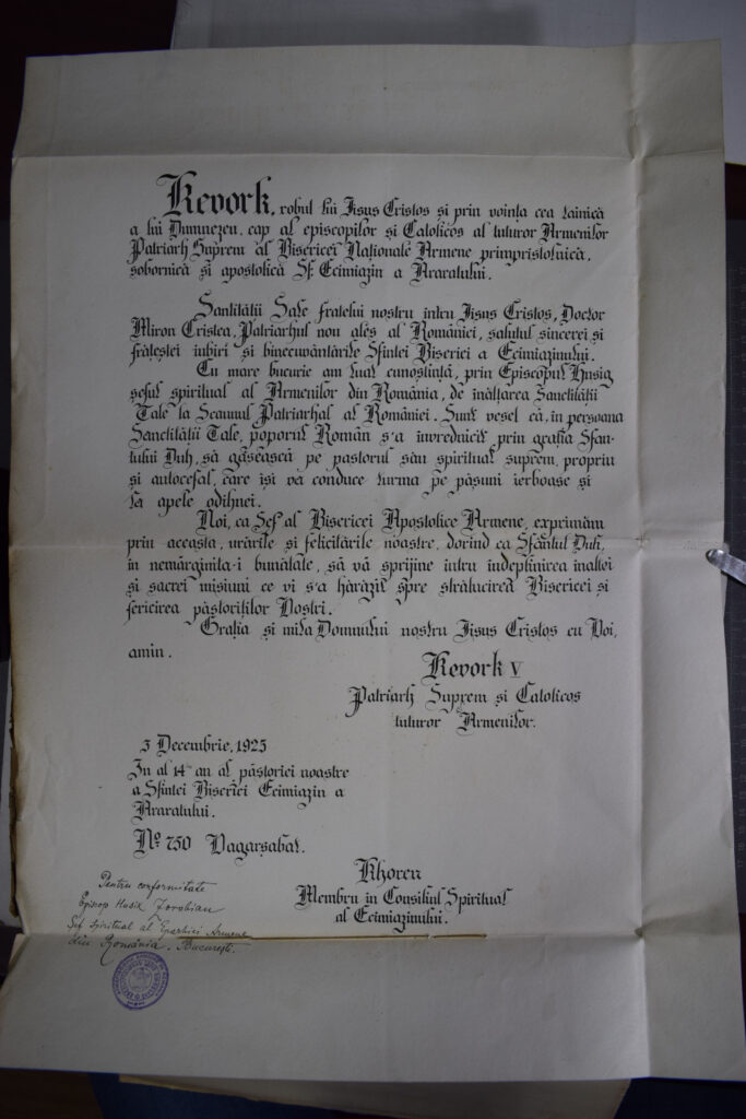 Հաճութեամբ սրտի հասու եղաք ի գրութենէ հոգևոր որդւոյն մերոյ և Առաջնորդին Հայոց Ռումանիոյ Տ. Յուսիկ եպիսկոպոսի զընտրութենէ Ձերմէ յաթոռ Պատրիարքութեան Ռումանիոյ: Ուրախ եմք, զի ի դէմս Ձեր ժողովուրդն Ռումանիոյ, արժանավորեցաւ շնորհոք Ս. Յոգւոյն՝ ունել զիւր հովուապետ սեպհական և ինքնագլուխ, որ հովուելոց է զբանաւոր հօտ իւր իր վայրի դալարւոջ և առ ջուրս հանգստեան: