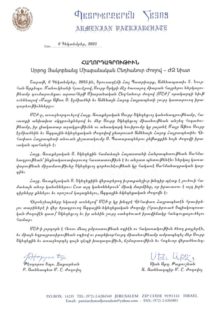 Շաբաթ, 6 Դեկտեմբեր, 2025-ին, Երուսաղէմի Հայ Պատրիարք, Ամենապատիւ Տ․ Նուրհան Արքեպս․ Մանուկեանի հրաւէրով, Սուրբ Երկրի մէջ ծառայող միաբան հայրերու ներկայութեամբ գումարուեցաւ արտահերթ Միաբանական Ընդհանուր ժողով (ՄԸԺ)՝ օրակարգի նիւթ ունենալով «Մայր Աթոռ Ս․ Էջմիածնի եւ Ամենայն Հայոց Հայրապետի շուրջ կատարուող իրադարձութիւնները»։