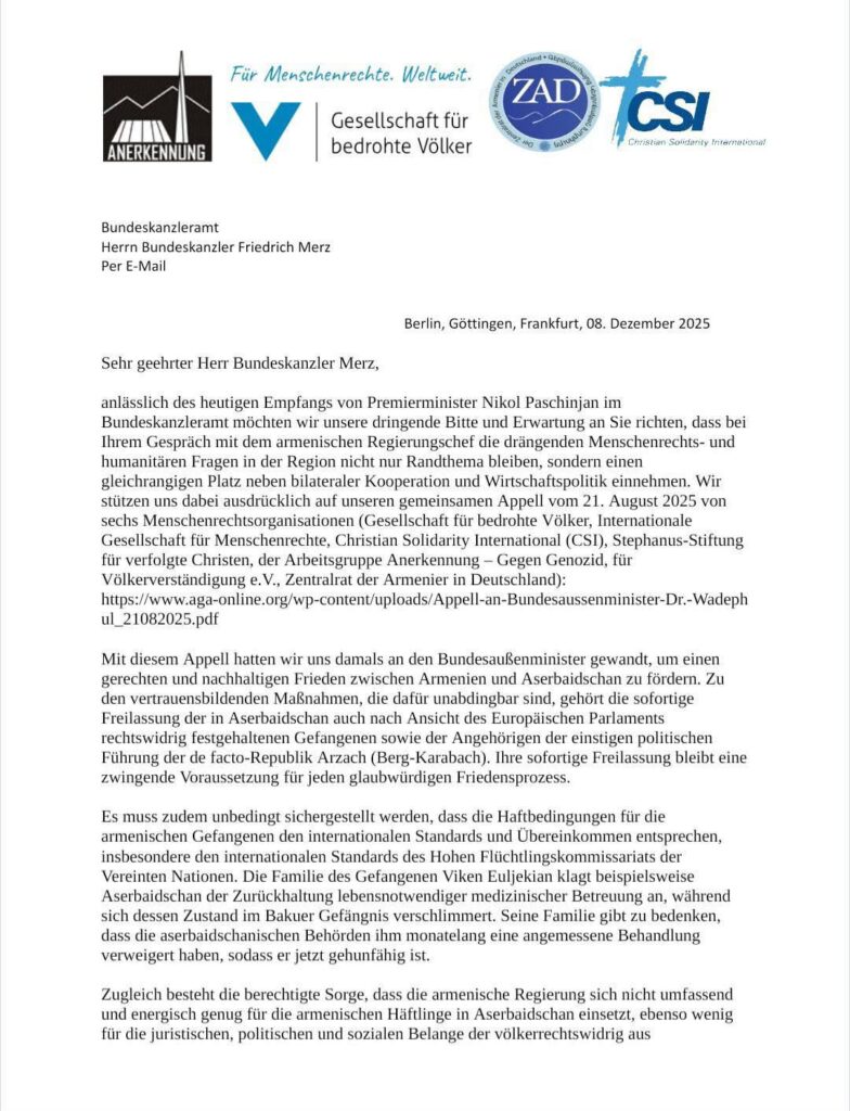 -Մարդու իրավունքների մի շարք կազմակերպություններ և Գերմանահայոց Կենտրոնական Խորհուրդը համատեղ դիմել են Գերմանիայի Դաշնային Հանրապետության Կանցլերին