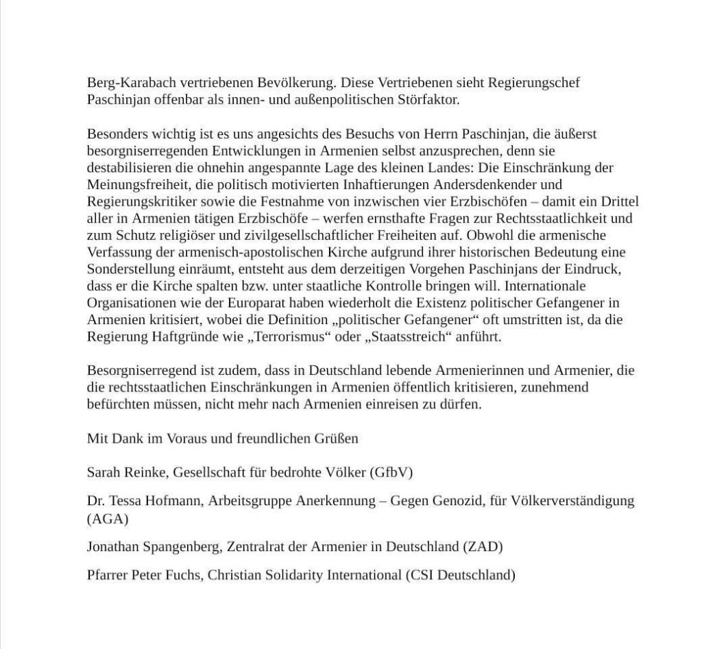 Հիշեցնենք, որ նախօրեին Մարդու իրավունքների մի շարք կազմակերպություններ և Գերմանահայոց Կենտրոնական Խորհուրդը համատեղ դիմել են Գերմանիայի Դաշնային Հանրապետության Կանցլերին՝ կոչ անելով, որ ՀՀ վարչապետ Նիկոլ Փաշինյանի հետ հանդիպման ընթացքում անուշադրության չմատնվեն իրենց հայտարարությունում շեշտադրվող հիմնարար խնդիրները։ Ստորև ներկայացվում է կազմակերպությունների համատեղ հայտարարության ամբողջական տեքստը։
