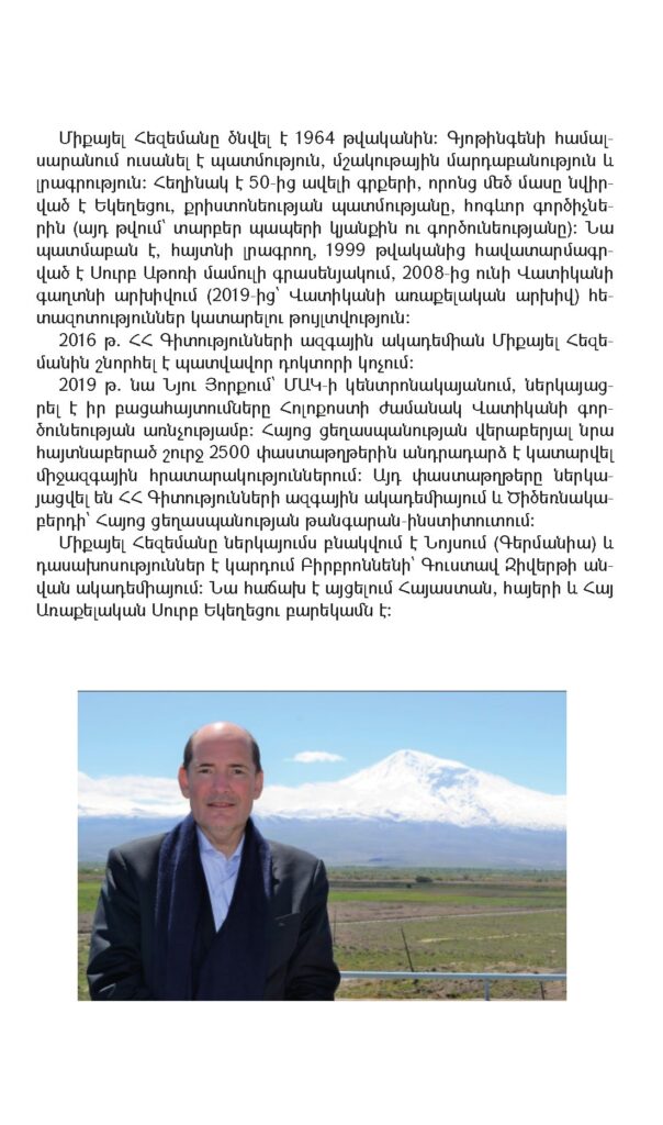 Օրհնությամբ Ն.Ս.Օ.Տ.Տ. Գարեգին Բ Ծայրագույն Պատրիարք և Ամենայն Հայոց Կաթողիկոսի՝ Մայր Աթոռ Սուրբ Էջմիածնի հրատարակչությունը լույս է ընծայել գերմանացի պատմաբան և ցեղասպանագետ Միքայել Հեզեմանի «ՀԱՅՈՑ ՑԵՂԱՍՊԱՆՈՒԹՅՈՒՆԸ. Առաջին աշխարհամարտի ընթացքում իրագործված մեծագույն հանցագործությունն ըստ Վատիկանի գաղտնի արխիվի անտիպ փաստաթղթերի» (թարգմ. գերմաներենից՝ Վ. Զարգարյանի, խմբ.՝ Ա. Հայրունի) վերնագրով ուսումնասիրությունը։