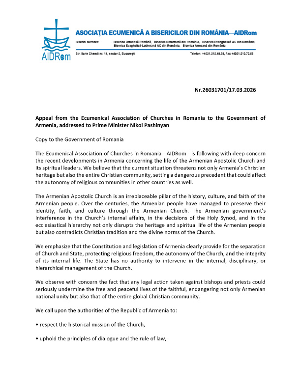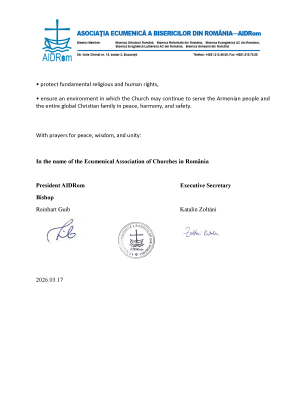 Ռումինիայի Եկեղեցիների Էկումենիկ Ասոցիացիան խոր հոգևոր մտահոգությամբ հետևում է Հայաստանում վերջին զարգացումներին, որոնք առնչվում են Հայաստանյայց Առաքելական Սուրբ Եկեղեցուն և նրա սպասավորներին։ Մեր դիտարկմամբ, ներկայիս զարգացումները սպառնում են ոչ միայն Հայաստանի քրիստոնեական ժառանգությանը, այլև ողջ քրիստոնեական համայնքին՝ ստեղծելով վտանգավոր նախադեպ, որը կարող է ազդել այլ երկրներում կրոնական համայնքների ինքնավարության վրա։