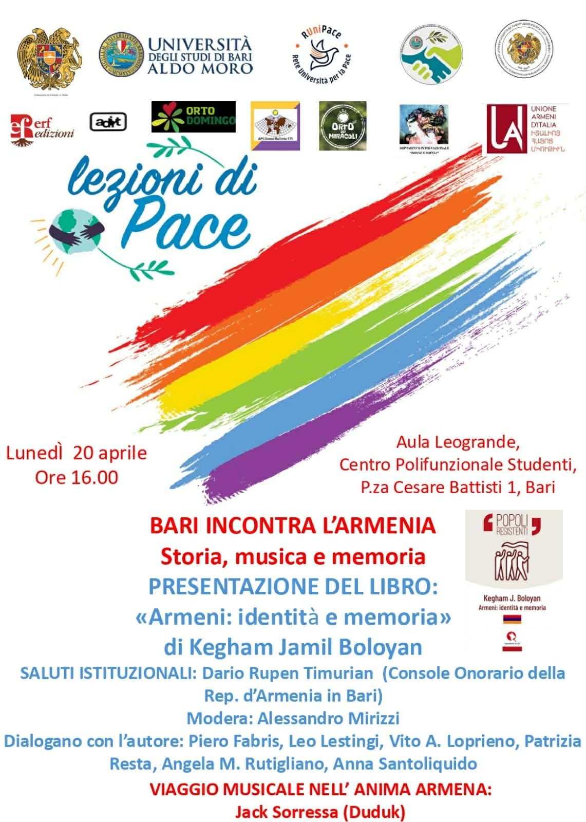 Ապրիլի 20-ին, ժամը 16:00-ին, իտալական Բարի քաղաքում տեղի կունենա Գեղամ Բոլոեանի «Հայեր․ ինքնություն և հիշողություն» գրքի շնորհանդեսը «Խաղաղության դասեր» ծրագրի շրջանակում։ Ձեռնարկը կազմակերպել է Միջֆակուլտետային Խաղաղության Հետազոտությունների «Ջուզեպպե Նարդուլի» կենտրոնը Ուսանողների բազմաֆունկցիոնալ կենտրոնի (նախկին «Փոստի պալատ») Լեոգրանդե դահլիճում՝ «Բարին հանդիպում է Հայաստանին – պատմություն, երաժշտություն և հիշողություն» խորագրով։