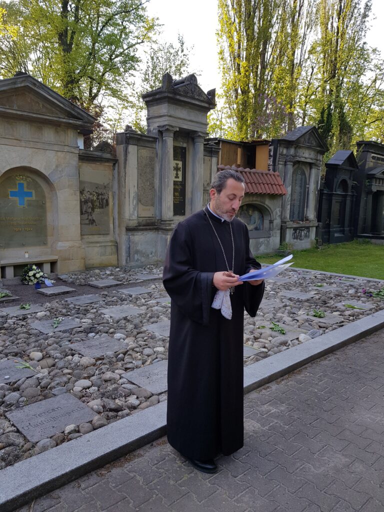 Ավարտին ներկաները ծաղկեպսակներով մոտեցան Ցեղասպանության հուշակոթող պատին՝ իրենց հարգանքի տուրքը մատուցելու։ Այստեղ  բեռլինահայ համայնքի հոգևոր առաջնորդ Տեր Հակոբ քահանա Հակոբյանը բարեխոսության կարգ մատուցեց՝ նշելով․ «Սիրելի՛ ներկաներ, այսօր կանգնած ենք լռության և հիշողության սահմանին։ Ապրիլի 24-ը պարզապես օր չէ օրացույցում, այն մեր հավաքական հիշողության ցավոտ, բայց անջնջելի էջն է։ Ապրիլի 24-ը Հայոց Ցեղասպանության զոհերի հիշատակի օրն է։ Այսօր գլուխ ենք խոնարհում 1,5 միլիոն անմեղ զոհերի հիշատակի առաջ՝ նրանց, ովքեր կորցրին իրենց կյանքն այն պատճառով, որ հայ և քրիստոնյա էին։ Մենք հիշում ենք ոչ միայն նրանց մահը, այլև նրանց կյանքը՝ նրանց երազանքները, մշակույթը, ստեղծագործ միտքը, ընտանիքներին։ Մենք հիշում ենք, որովհետև հիշողությունը մեր ուժն է, իսկ մոռացությունը նշանակում է կրկնել նույն ողբերգությունը։  Ապրիլի 24-ը նաև արդարության կոչ է։ Քանի դեռ ճշմարտությունը լիովին չի ընդունվել ու դատապարտվել, մեր պայքարը շարունակվում է՝ հանուն ճանաչման, հանուն պատմական արդարության, հանուն այն աշխարհի, որտեղ նման հանցագործություններն այլևս տեղ չեն ունենա»։